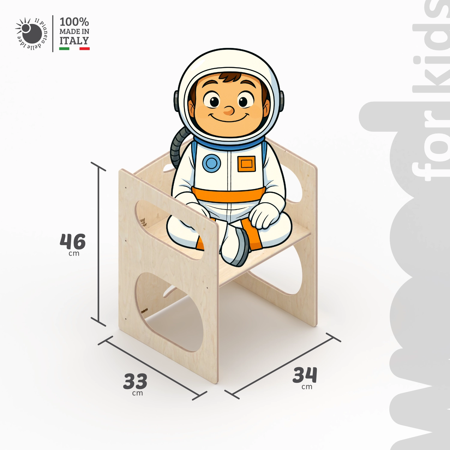 La poltrona Montessori della linea Wood for Kids presenta 3 diverse modalità di utilizzo: seduta bassa, seduta alta e piano di lavoro. È una seduta ispirata ai principi di Maria Montessori.