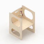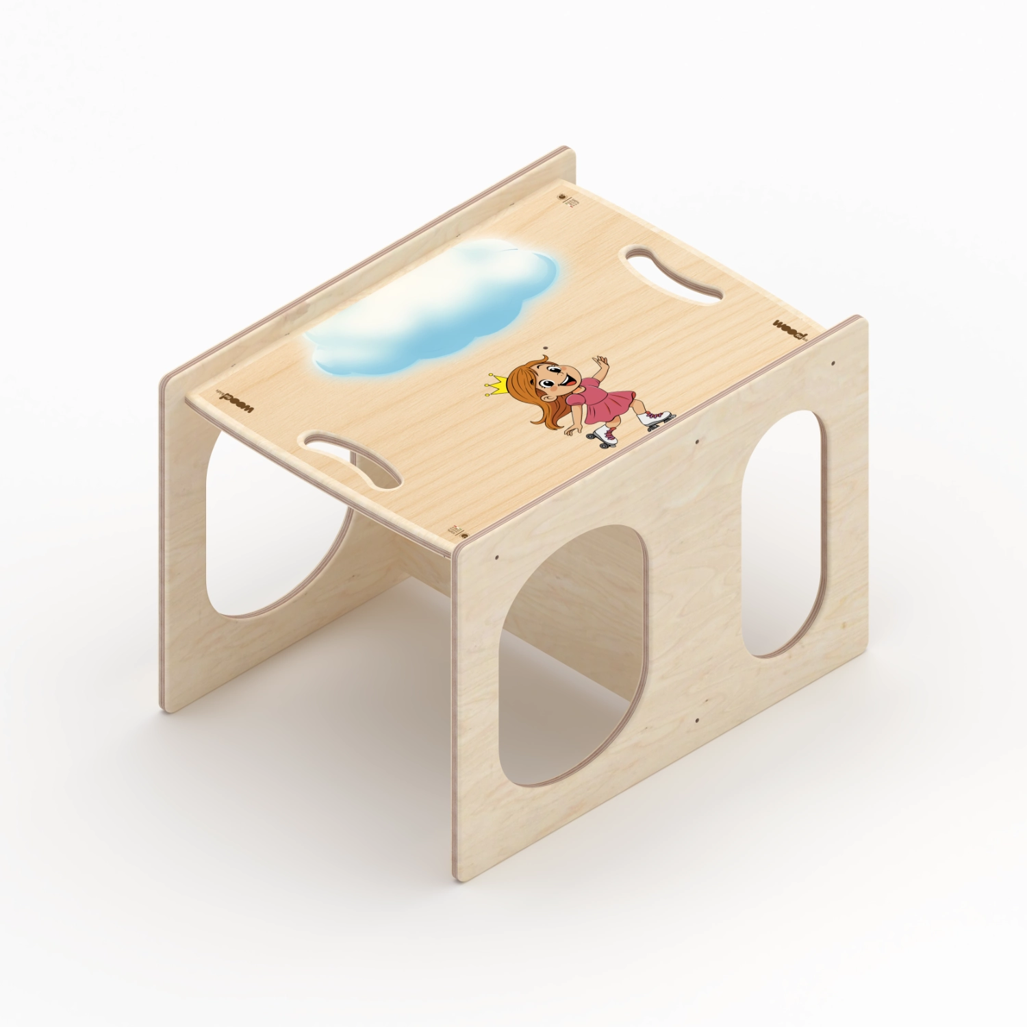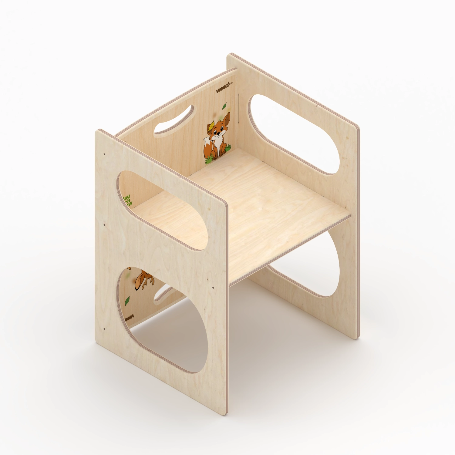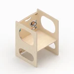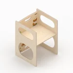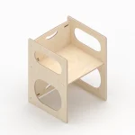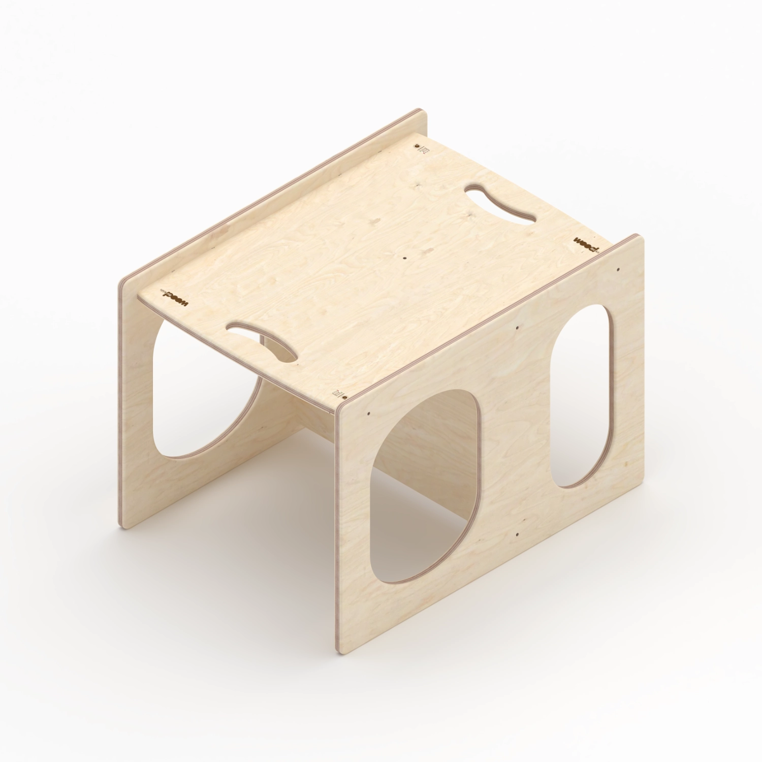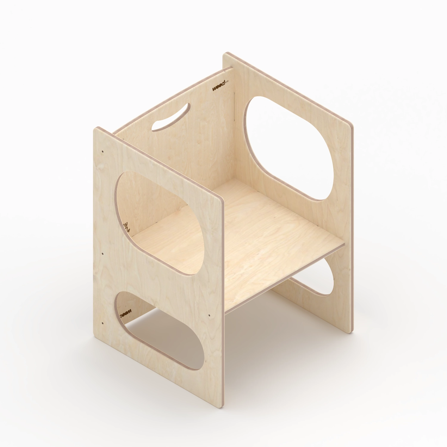 La poltrona Montessori della linea Wood for Kids presenta 3 diverse modalità di utilizzo: seduta bassa, seduta alta e piano di lavoro. È una seduta ispirata ai principi di Maria Montessori.