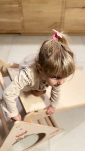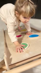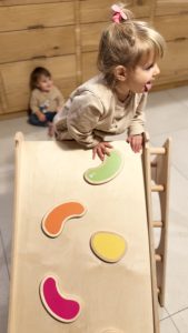 Coerentemente con i principi dell’insegnamento delle pediatre Pikler e Montessori, con questi due strumenti il bambino potrà organizzare il proprio spazio di gioco e di apprendimento, sviluppando equilibrio e posizione eretta, acquistando così fiducia nei propri movimenti e nelle proprie capacità.