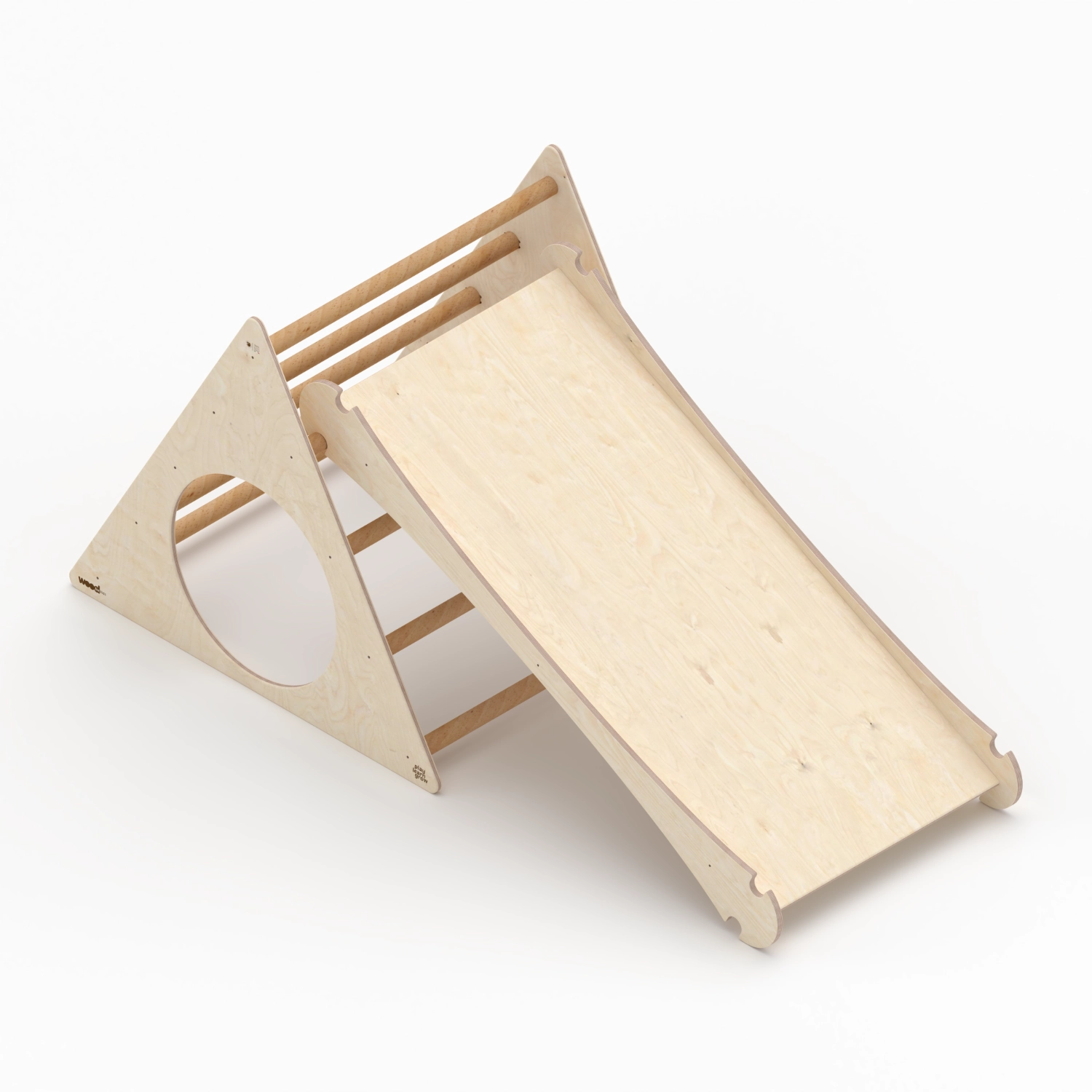 Abbiamo creato due strutture a triangolo isoscele che fanno poggiare il gioco su una ampia superficie, rendendolo stabile e sicuro. Il triangolo garantisce solidità pur non superando i 5 kili di peso (anche lo scivolo pesa 5 kili). E‘ anche semplice da montare: le pareti laterali funzionano da struttura portante sulla quale avvitare i pioli in faggio rotondo, perfettamente levigato. Hanno poche viti, un cacciavite sarà sufficiente per montarlo.